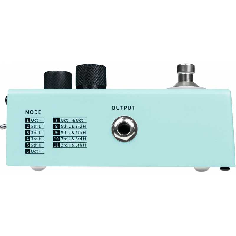 At its core, the pedal offers a versatile pitch harmonizer effect. The 'Key' dial allows users to choose to harmonize their important with any note in the chromatic scale, with the 'Sharp' LED button being used to select sharp notes. Once chosen, the 'Mode' dial facilitates further customization, offering 11 different harmony modes that control the harmony's interval. This includes all classic intervals such as octaves, fifths, and thirds.