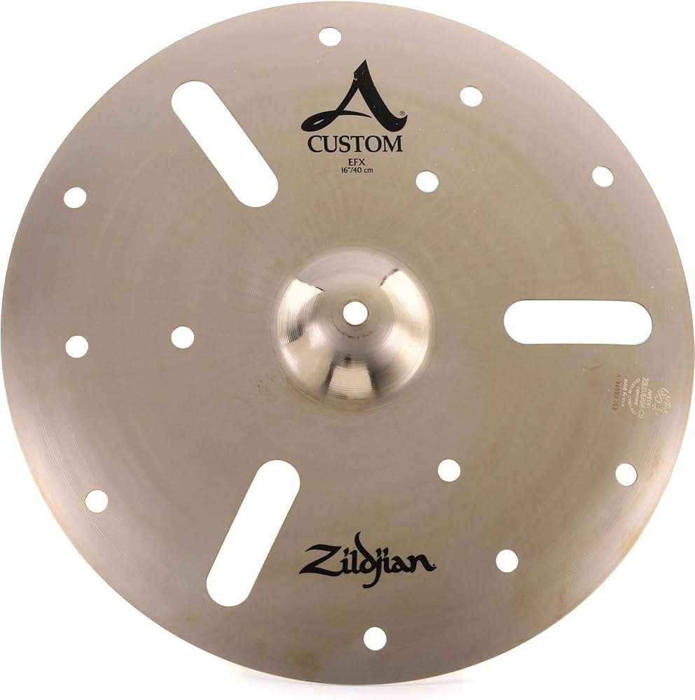 The A Custom EFX is a brighter version to the K Zildjian. This special effect cymbal features a unique laser "cut out" design that creates a dry, trashy sound, with sudden explosiveness and quick decay. Crash it for heavy, punctuating accents, or stack it with other cymbals to explore even more articulations, colors and effects. A Custom EFX cymbals come in a shimmering, brilliant finish and extra thin weight.