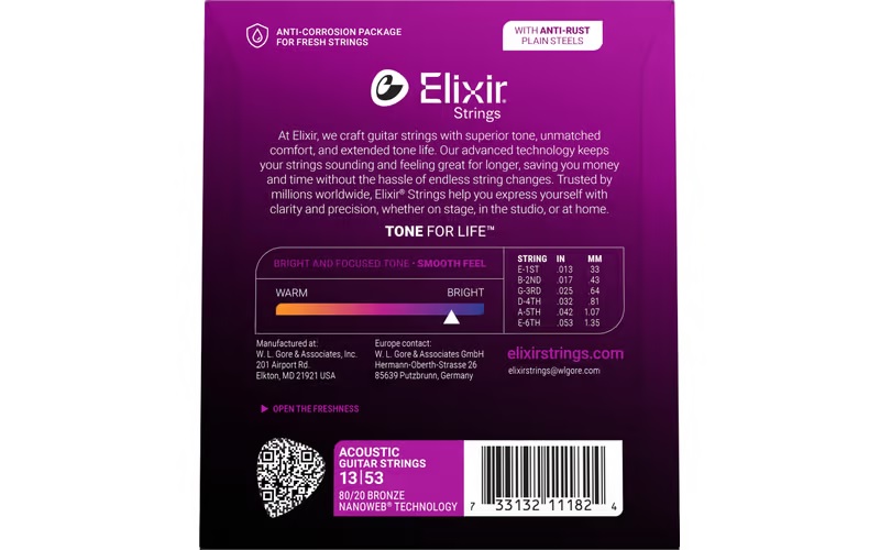 Elixir® Acoustic 80/20 Bronze Strings with NANOWEB Coating deliver a bright, lively tone together with extended tone life that players have come to expect from Elixir Strings.